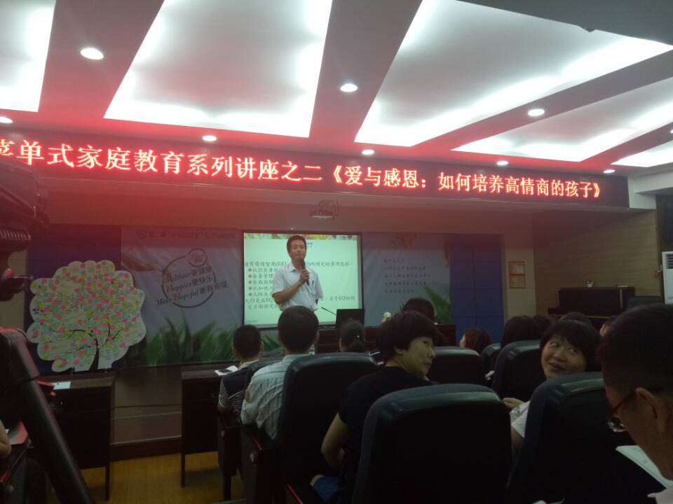 心理系老师、温大心理咨询与测评中心资深心理咨询专家翁树澍博士前往温州市南浦实验中学,为七、八年级240名家长开展了幸福套餐家庭教育系列讲座的第二场,主题为《爱与感恩——如何培养高情商的孩子》讲座。整个会场座无虚席,家长们聚精会神聆听、沉思、笔记;互动环节提问踊跃、交流顺畅;旁听的教师及本校教育实习同学都感到都受益匪浅。