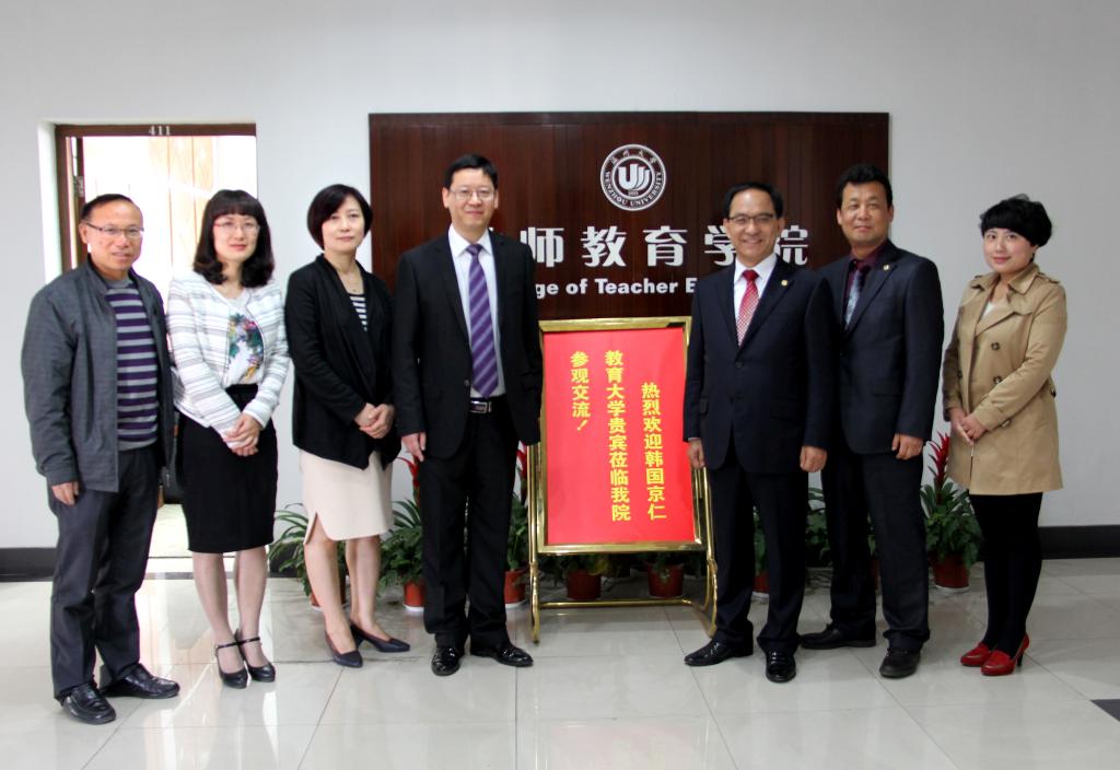 领导又进行了亲切的座谈。郑信军院长代表学院致欢迎辞,并详细介绍了学院的学科、专业建设情况。李在熙校长也介绍了韩国京仁教育大学的基本情况。双方就小学教育专业的人才培养模式进行了积极的交流和探讨。
