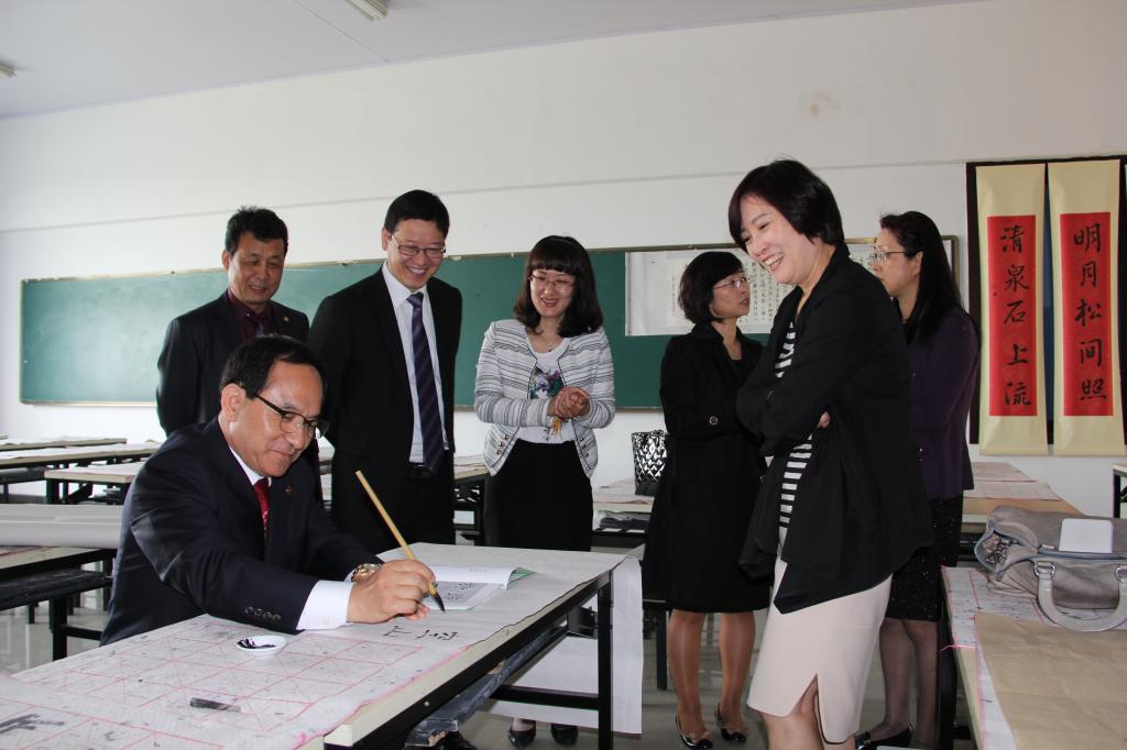 教师教育实验中心。在未来教室实验室里,韩国客人对未来教室先进的仪器设备和教育理念所吸引,并就未来教室的使用方法和未来设想展开了较为丰富的讨论和交流;在书法实验室,李在熙校长兴趣盎然,手握毛笔,挥笔写下“空山”二字。他们对实验中心精良的仪器设备和优越的教学环境颇为赞赏。