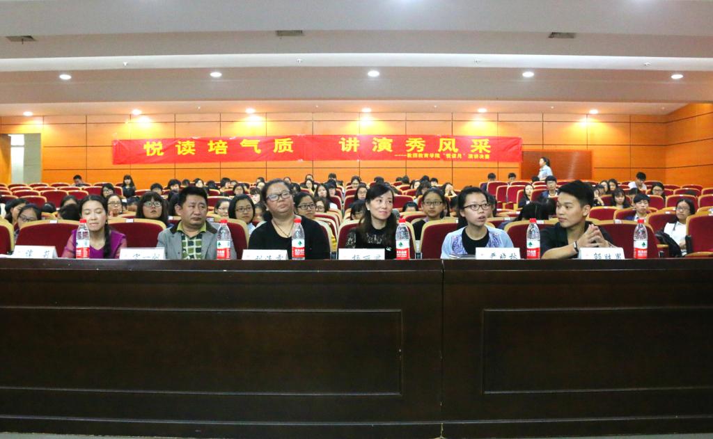2015年10月14日18:30,由教师成人网站 举办的“悦读月”演讲决赛于温州大学南校雁山厅顺利举行。小教系书记刘海霞,语言工作坊指导老师宋一帆以及小教系老师谭莉等评委,院党总支副书记杨丽君、学生科辅导员严晓秋、邵胜男等老师,各位选手、工作人员及学生观众共计220余人出席活动。