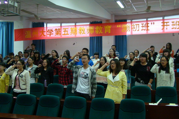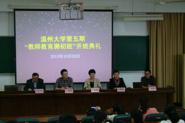 随后,温州大学党委副书记林娟娟老师致辞。她首先向与会的领导和专家表示了衷心的感谢并对学员表达由衷的祝贺。随后,她就“溯初班”命名的由来,办学目标,办学制度,办学思想,办学宗旨,课程理念以及课堂形式等方面作了具体的阐述。她谈到,“溯初班”在追慕先辈的同时旨在提高师范生的教师技能。我们要将教学落到实处,在省师范技能比赛以及岗前的编制考试中使学生以优异的成绩通过层层关卡,结出丰硕的果实,提高社会影响力。最后,她对所有在场的学员提出了两点希望:一、少一点功利心,多一点责任心。这要求同学们不要将荣誉和奖项作为最后的目标和追求,对自身和对教师职业要有更高的要求。二、少一点浮躁心,多一点实干劲。进入“溯初班”意味着同学们比其他的同学有了更繁重的学习任务。但同时大家也应该看到,我们比其他的有了更多的学习机会,能够获得更多的学习资源,同学们要驱逐内心的杂念,努力学习,深入实践。