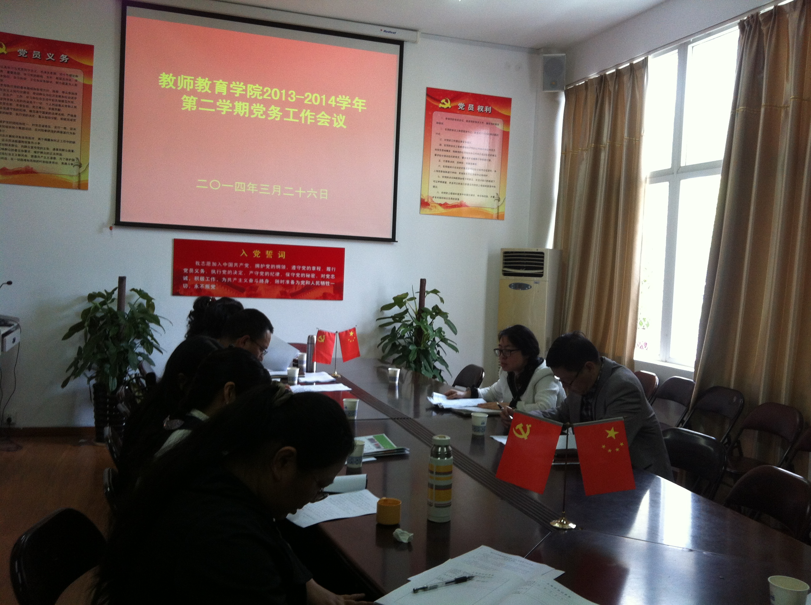 新学期第一次党务工作会议在3号楼党员之家召开。参加会议的有学院院长、党总支副书记郑信军、副书记嵇小怡、工会主席朱伟、学生科科长陈秀雅、全体教工党支部书记等。会议由嵇小怡副书记主持。