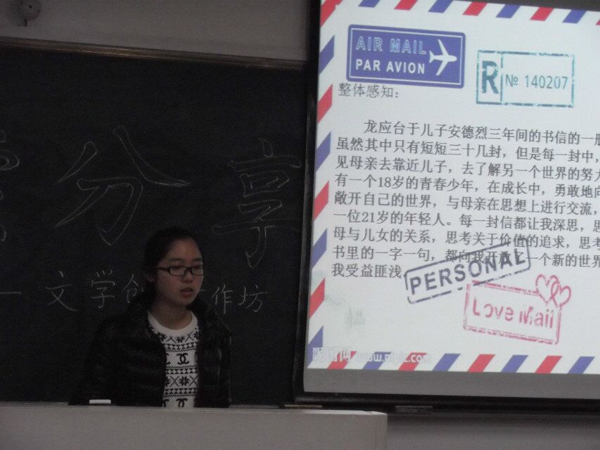 在阅读分享交流之后,指导师刘海霞老师还邀请了工作坊的王一莉同学上台交流。王一莉有突出的写作才华,连续两届获得温州大学白晖华文学奖一等奖。王一莉同学主要介绍了自己小说创作的经验,提醒大家要注意环境描写、人物塑造、情节创设和细节描写。她总结道,优秀的小说必须要有创新精神和思想内核,要保留“神秘感”,切莫让人一眼望到底。