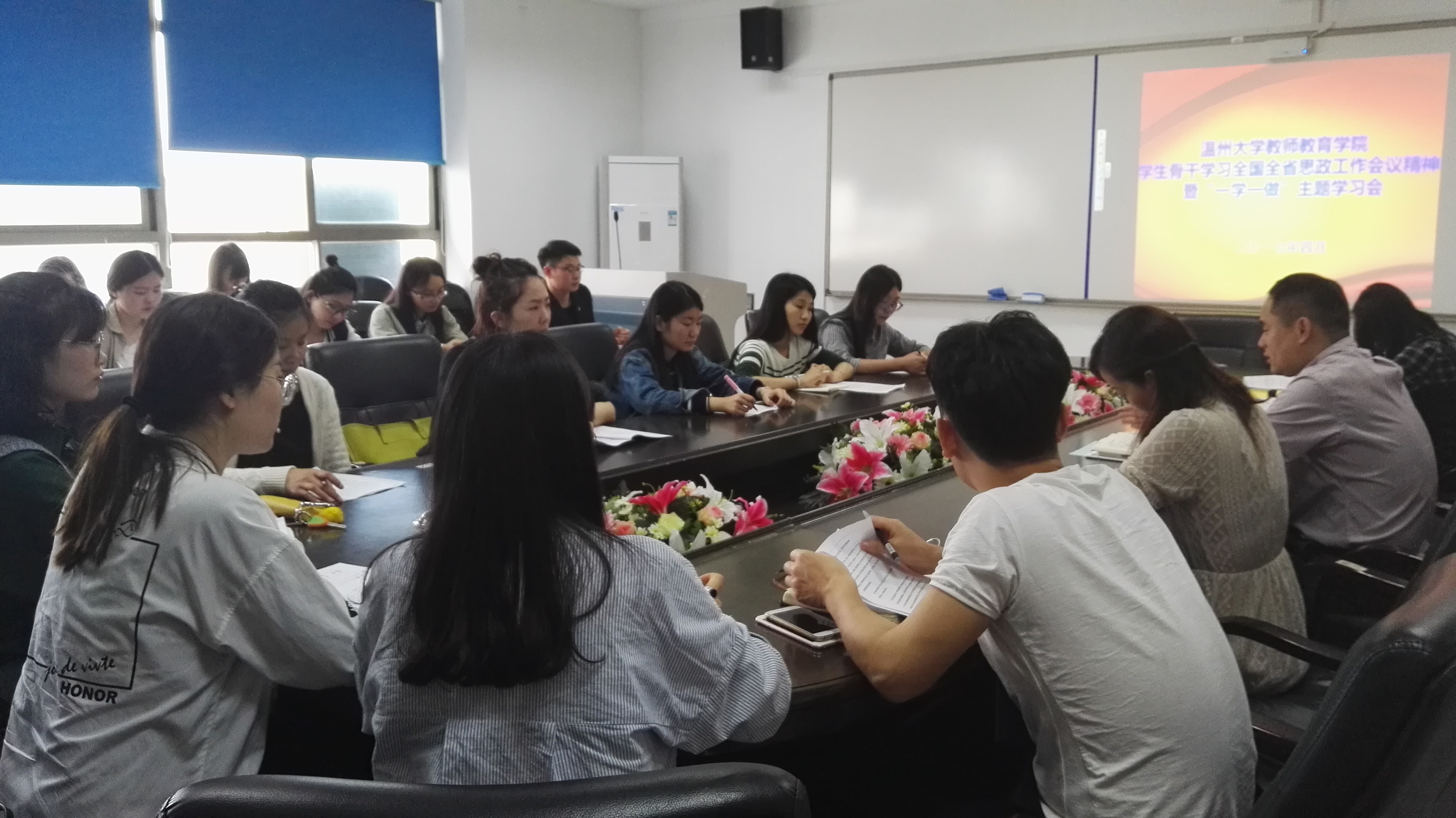 的当下面临的工作现状,深刻阐述了“立德树人”作为高校立身之本的重要性。随后,杨书记指出,大学生要将全国全省思想政治工作会议精神和大家的学习和生活相结、理论和实践相结合。与此同时,要在读书期间锤炼自身,让自身更有涵养、有底蕴;既要扎实掌握教育专业的理论,又要时刻关注所在学科和专业领域的前沿动态,肩负理想和信念,敢于担当。在今后的学习和生活中通过行动落实会议精神,做善于沟通,乐于奉献,有理想有信仰有文化的大学生。