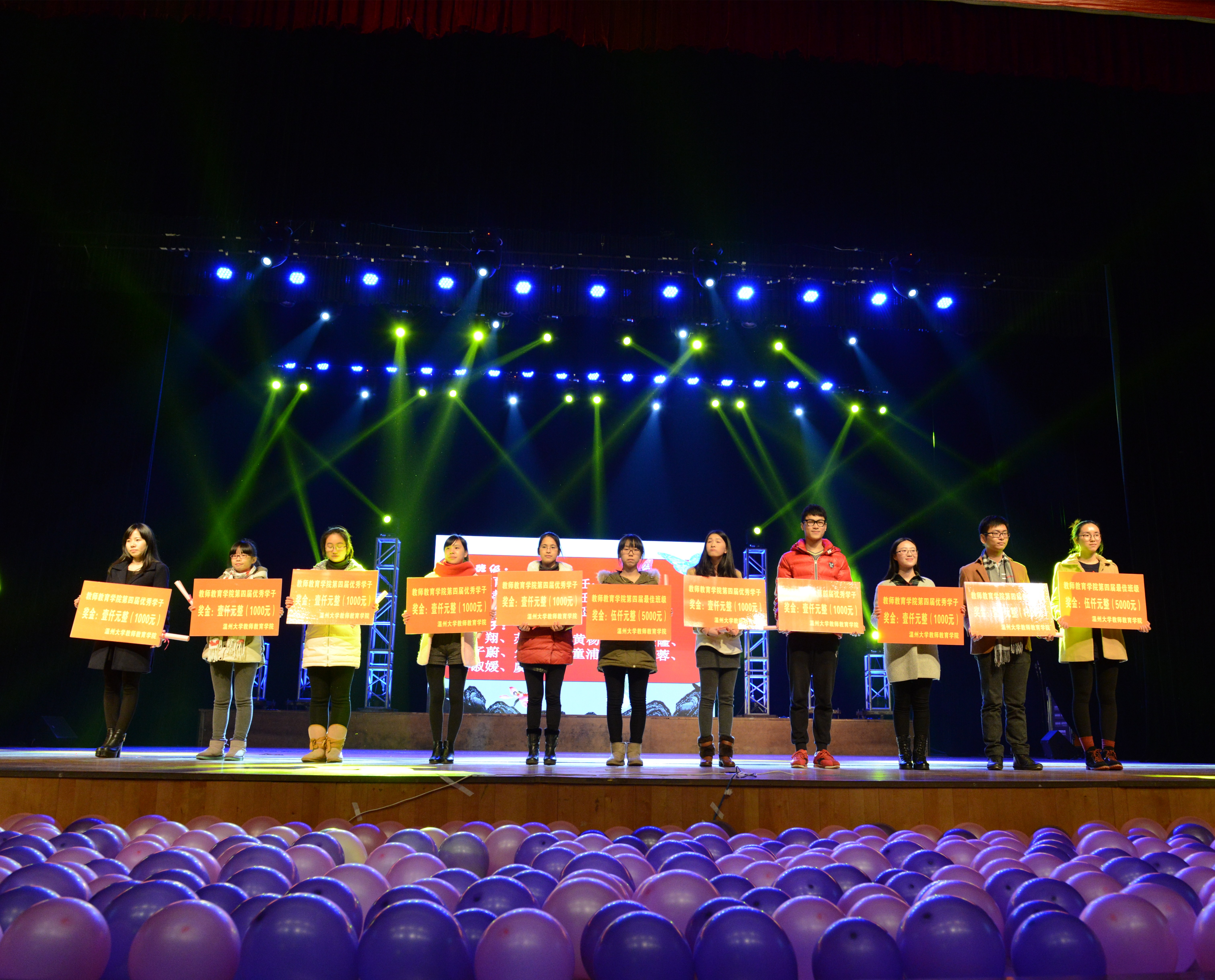 学风表彰大会穿插在精彩的节目之中,相得益彰,更添几分成功的喜悦。首先表彰的是校优秀班主任、校最受爱戴的老师、各项学生竞赛比赛项目的优秀指导老师,学生们为老师送上了学生自己购买的暖手宝,礼物虽小,但在寒冷的冬季,表达了学生对老师们浓浓的感恩之情。随后表彰了校优良学风班、学习标兵、院最佳班级、优秀学子,以及在竞赛、比赛中取得优异成绩的学子们,对他们取得的成绩给予了充分的肯定。