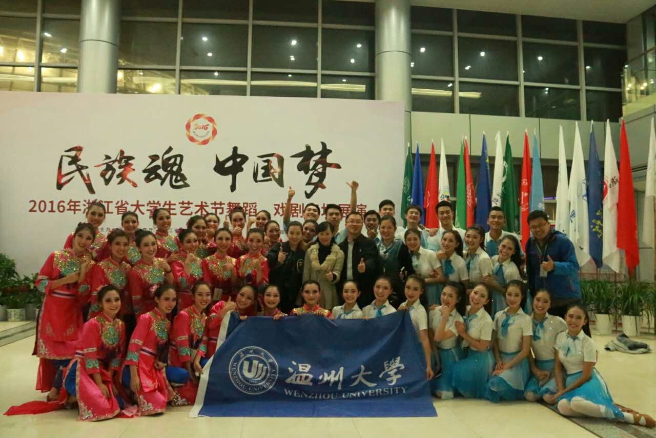 近日举办的2016浙江省大学生艺术节在杭州圆满落幕。在为期一周的现场展演中,温州大学学子展现风采,斩获6项一等奖,4项二等奖。其中温州大学教师成人网站 选送的6个节目——群舞《创业园里的青春》、群舞《花儿娜泽》、双人舞《夫妻哨》、话剧《搭把手》、十佳作品《绿色心情》均获2016年浙江省大学生艺术节展演比赛一等奖,十佳作品《一路上有你》获二等奖,部分节目获网络人气奖、最佳组合奖等,其中2个一等奖喜获一等一的佳绩!