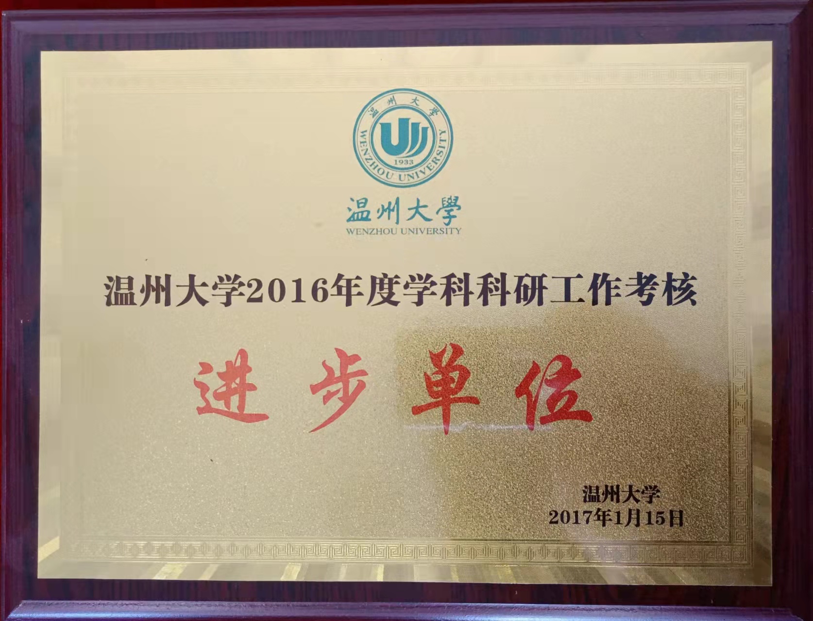 温州大学2016年度学科科研工作考核进步单位(2017-1-15)