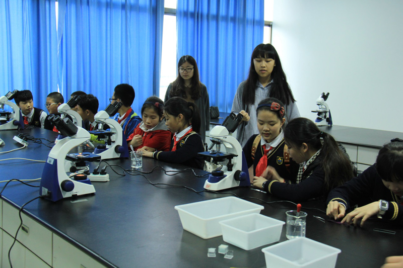 我们先将小学生分成了四组,让这四组小学生同时在四个不同的实验室开展体验活动。在实验室里,小学生们认真听取各实验室负责老师的讲解,不时提出疑问,踊跃参与,或互动交流。在自然科学室里,他们观察显微镜下的神奇世界;机器人实验室里,他们体验了智能机器人夹取、移动、投篮等运作全过程;在未来课堂实验室,他们体验了先进的教学媒体在教学中的应用;在心理测量实验室,他们安静答题,测试自己的能力。整个活动十分愉快。直到下午3点半小学生们才离开。实验室开放活动有效地利用学校资源,让孩子们体验了各种实验教学仪器,激发了他们对科学知识的兴趣。