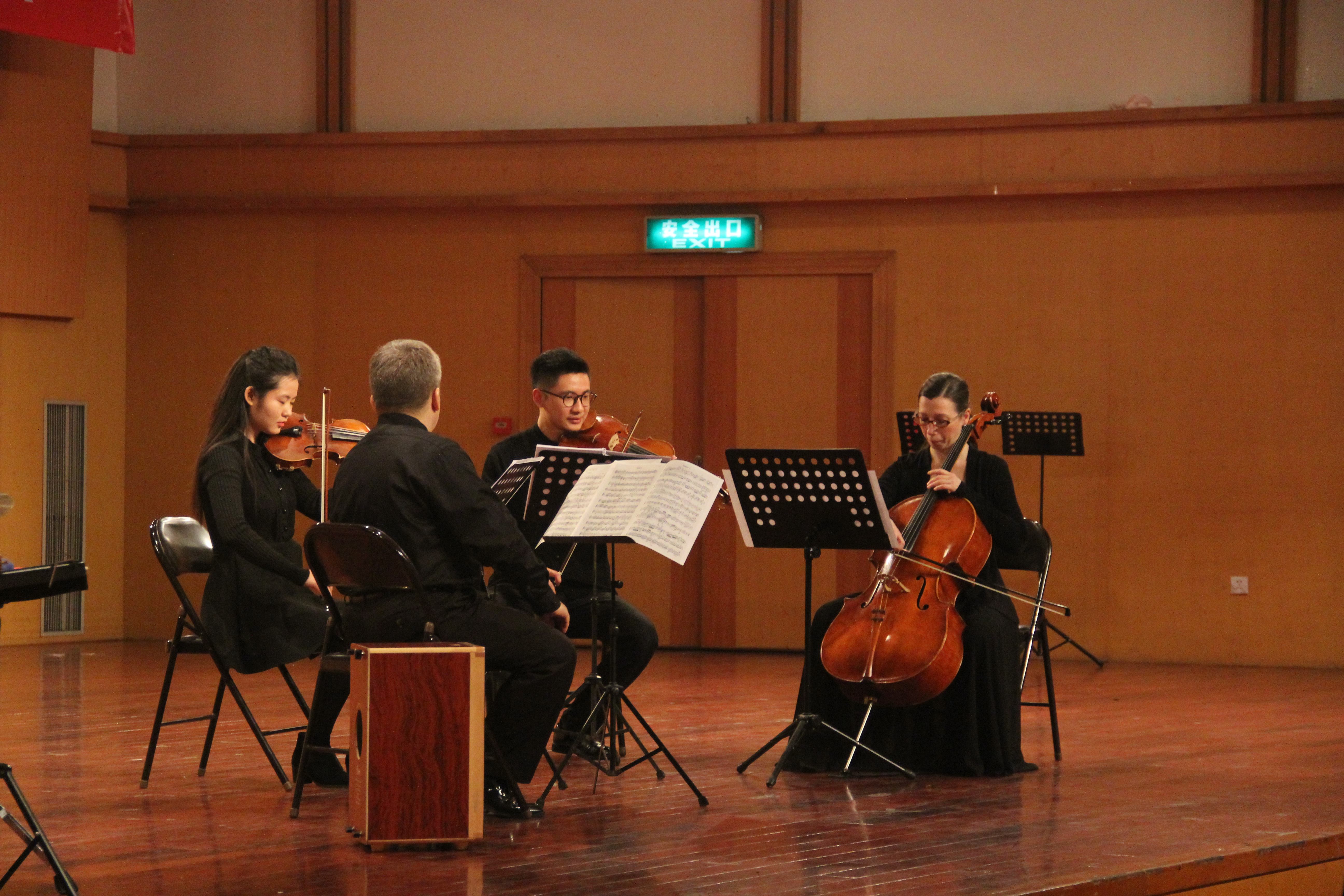 音乐会在主持人的精彩开场后正式拉开帷幕。第一首曲目是莫扎特的《弦乐小夜曲》,由哥特库米教授、龚弦、陈冠璋和席蒙娜巴尔布博士倾情演奏。乐曲开篇,开门见山,以活泼流畅的节奏和短促华丽的颤音,组成了欢乐的旋律,简单而充满了明朗有力的情绪色彩和青春气息,给人充满信心的感觉,给人留下难忘的印象。整个乐曲节奏明快、旋律生动、简洁利落和富有推动力,充分显示了演奏家们的高超技术,带给了在场观众一场无与伦比的听觉盛宴。