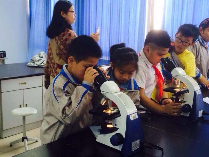 在生物探究实验室,金建钰老师带领11级小教科学班7位实习生,全力指导,让每一位“科学小达人”都能了解光学显微镜和体视显微镜的原理和基本操作方法。显微镜下的美丽世界,让孩子们惊叹不已。这种新科学仪器的使用,在将来能帮助孩子们更好地了解和探究我们身边神秘的微观世界。
