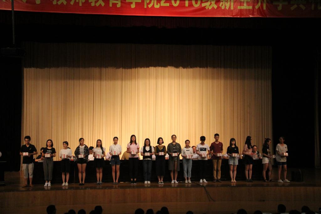 慷慨激昂的话语给在场每一位同学的脑海中都留下了深刻的记忆,而继新生代表讲话后,赠书这一温暖时刻开始了,学院领导为十七个新生班级赠送《平凡的世界》、《遇见未知的自己》、《推动自己,就是推动教育》、《优秀教师悄悄在做的那些事儿》、《成就最好的自己》等书籍,拉开了学院2016年“悦读月”活动的序幕,鼓励学生师范气质培养,从读好书开始,场面温馨感人。伴随着校歌的响起,全体人员奏唱校歌,怀着对温州大学的热爱与敬意,每个人的歌声中都饱含热情与朝气。