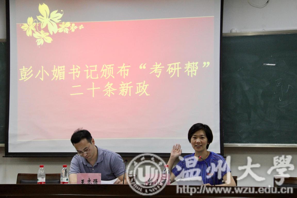 会议伊始,潘士杰引出会议主题,讲解流程,随后彭小媚作考研动员讲话,并阐述了考研的重要性。考研不仅是自身的需要,更是社会的需要,通过考研可以提升自我的学习能力,工作能力,提高自身的社会竞争力,从而更好的实现自我价值。随后彭小媚还耐心的解答了学生考研的疑惑,根据自己的宝贵经验,让同学们认清当前形势,帮助同学明确目标。同时颁布学院独创、凝集师生心血的“考研帮”的二十新政,学院将从考研条件,考研服务,考研人员和考研经费四个方面,为考研学子营造学习氛围浓厚的考研环境,提供学子们温馨考研服务,还有坚守无私的为同学们进行专业技能培训和考研疑惑的解答的多名教师,用陪伴和鼓励和同学们一起度过备考期,教院更从资金上对考研学子进行帮扶,为考研学子提供环境保障、服务保障、师资保障、资金保障,助力考研。