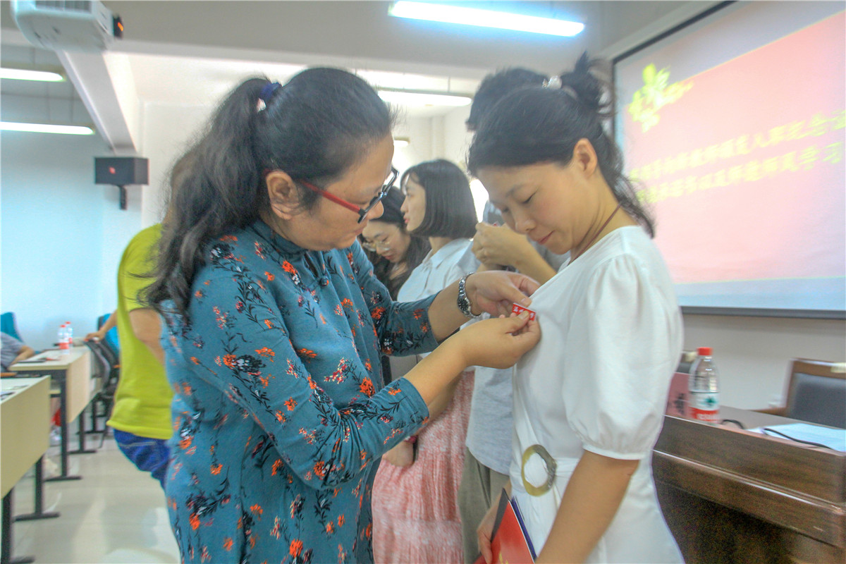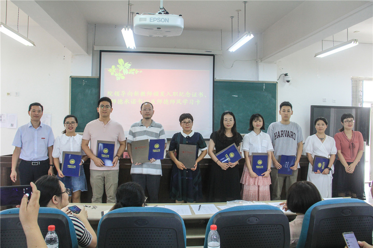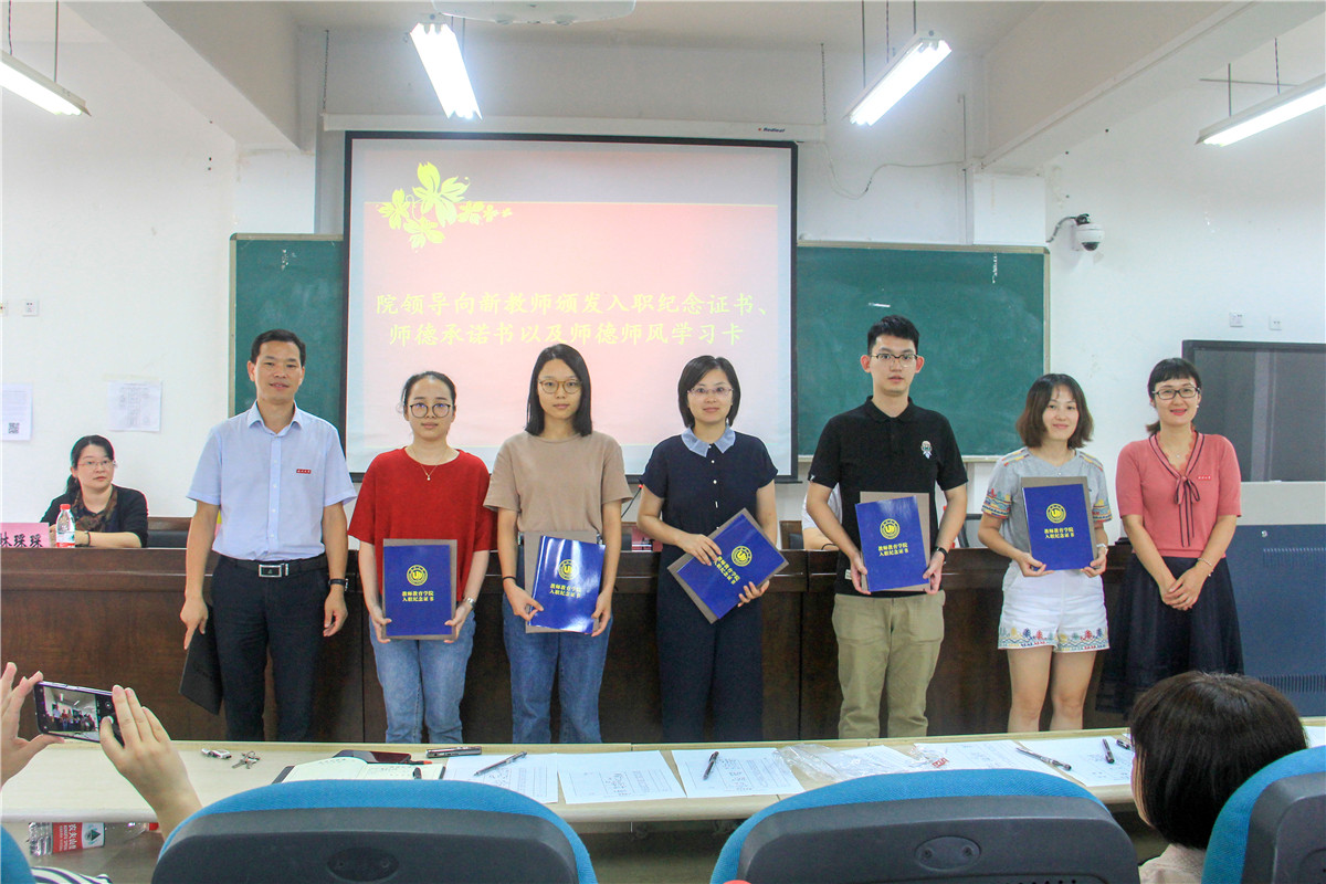 大会首先举行了专任教师和教辅、行政老师的入职仪式。在介绍了新教职工的基本情况后,学院领导为他们颁发了入职纪念证书、师德承诺书以及师德师风学习卡,所在系(科室)负责人为他们佩戴校徽,以此表达学院对新入职老师的热烈欢迎和殷切期望。