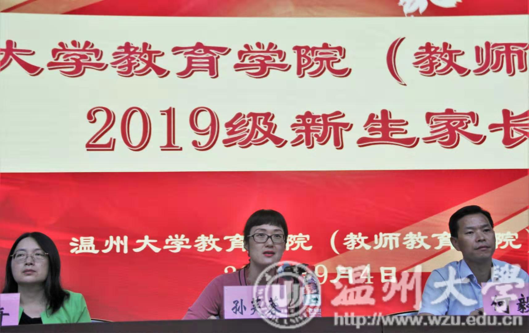 会议伊始,孙芙蓉院长以“第二家长”的身份,用“久”、“大”、“全”、“强、”“特”、“优”六个字向新生家长们介绍教院的六大特点。“久”即为学院历史悠久,教师教育底蕴深厚、源远流长。“大”不仅仅意为着学院之大,更是格局大、平台大,学院凭借雄厚的师资力量、丰富的教学资源给学生们提供了广阔的发展平台。“全”是指成人网站 为温州大学最大的全师范类专业人才培养学院。“强”即为办学实力强,为浙江省重点建设教师培养基地。同时,教院办学特色鲜明,致力于培养具有“博爱雅艺”的师范气质、突出的教育教学技能和教育创新能力、多能全域的未来卓越教育色人才。“优”是指学生入口优秀、学院培养过程优秀、毕业生出口优秀。面对刚刚经历角色转变的新生家长们,孙芙蓉院长强调,要让学院的发展惠及所有的学生,通过搭建家校沟通的桥梁,关注每个学生的发展,让学院因学生的优秀而辉煌。