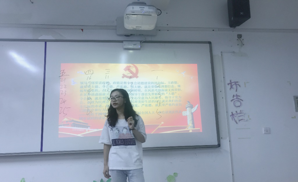 在6月4日晚,18级心理健康教育研究生黄蓉对18级应心班开展习近平书记讲话的宣讲。宣讲主要从树立理想信念、锤炼坚强党性等方面开展,最后通过提问环节,对同学们的疑问进行细心解答,是同学们在不知不觉中提高思想觉悟。
