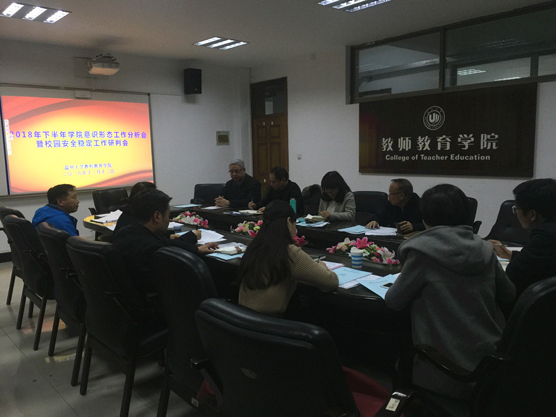 为深入贯彻中央、省委及学校部署要求,成人网站 于12月12日下午在9A410召开2018年下半年高校安全稳定隐患排查化解和校园意识形态领域分析研判工作会议,学院党政班子成员、跟岗院长、各科室负责人参加会议,杨立淮书记主持会议。