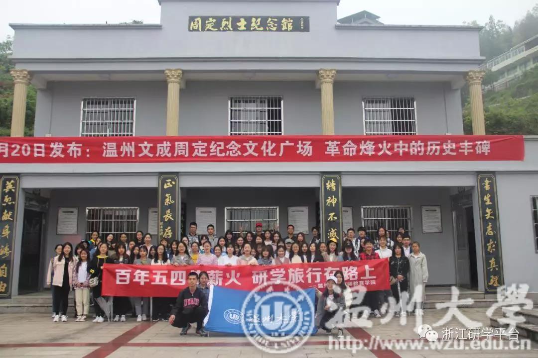 2019年4月27日,为纪念五四运动一百周年,深入学习五四精神。浙江省中小学生研学旅行研究与指导中心携手温州大学教师成人网站 、温州大学溯初学区走进文成县,开展以“百年五四传薪火,研学旅行在路上”为主题的研学旅行活动。此次研学活动由温州大学教师成人网站 学生科吴超智老师和何奔奔老师带队,研究生、本科生学生代表参加。