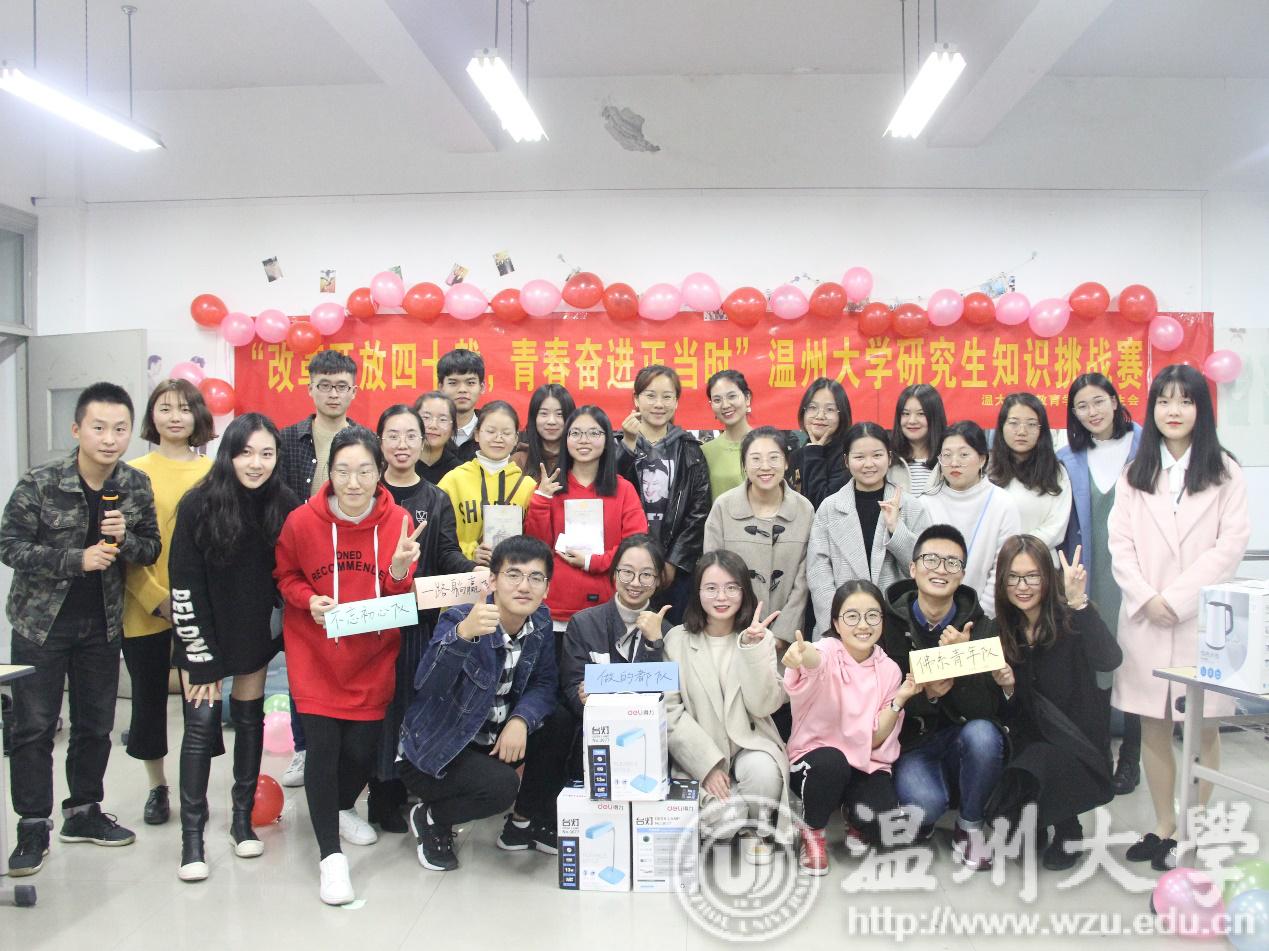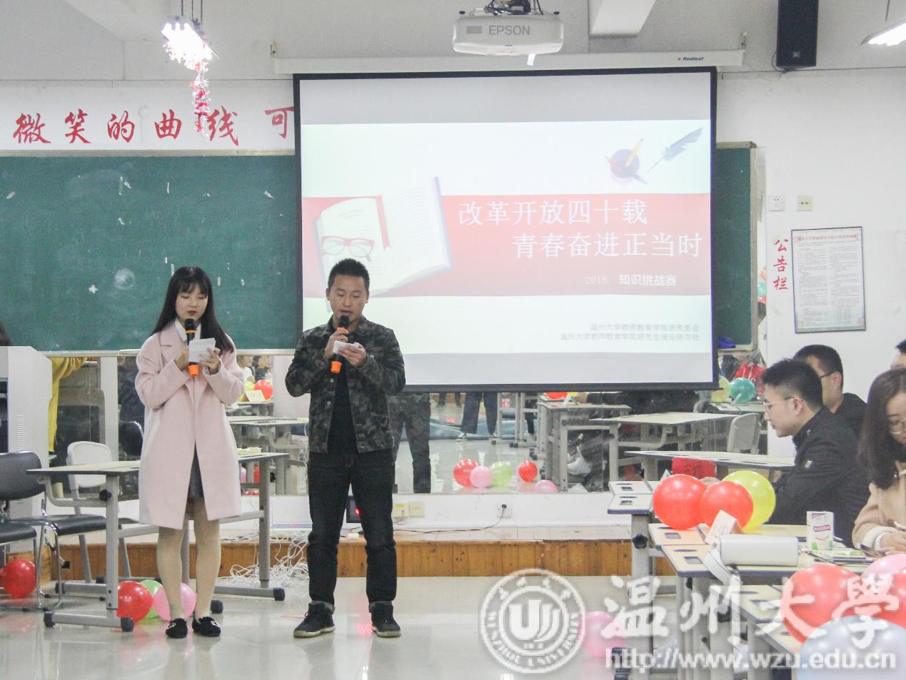 壮阔东方史,奋进新时代,为纪念改革开放40周年,引导同学们学习改革开放进程和建校历史,发扬温大学子求学问是的精神、鼓舞敢为人先的斗志,11月23日晚6:00,由教师成人网站 研究生会主办的“改革开放四十载,青春奋进正当时”纪念改革开放四十周年知识挑战赛在南校区9B308拉开帷幕。伴随着选手的热情和欢快的音乐,主持人陈雨婷、田道文宣布比赛正式开始。