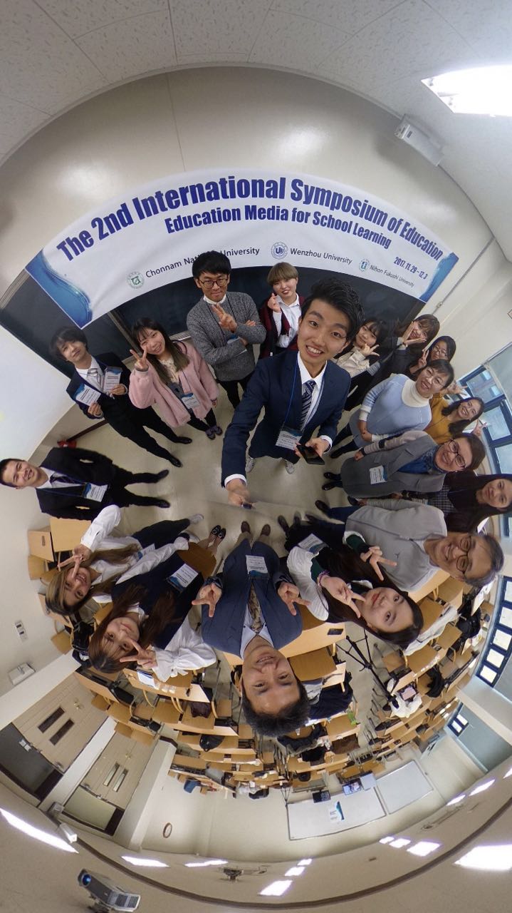 同时,学术交流会也设了三国学生代表轮流发表的子论坛,分三个阶段。日本福祉大学的学生们主要发表了小组活动中360度视频的可能性,多媒体对日本教育的影响以及多媒体在世界青年会上的反思,主要用许多的视频和照片向教授和同学们展示了机器360度拍照以及视频的功能,还有NHK对日本教育的影响。这令所有人都感到很吃惊,也感叹日本在这方面技术发展的先进性。接着,由在温州大学教育技术学专业大三本科生徐佳帅同学和大二本科生郑雅婷同学分别发表了新媒体在中国教育中的发展和人机交互软件在教学中的应用等。整个学术交流会上教授们和学生们均用英语演讲和提问,讨论气氛热烈,让我们领略到学习英语的重要性。