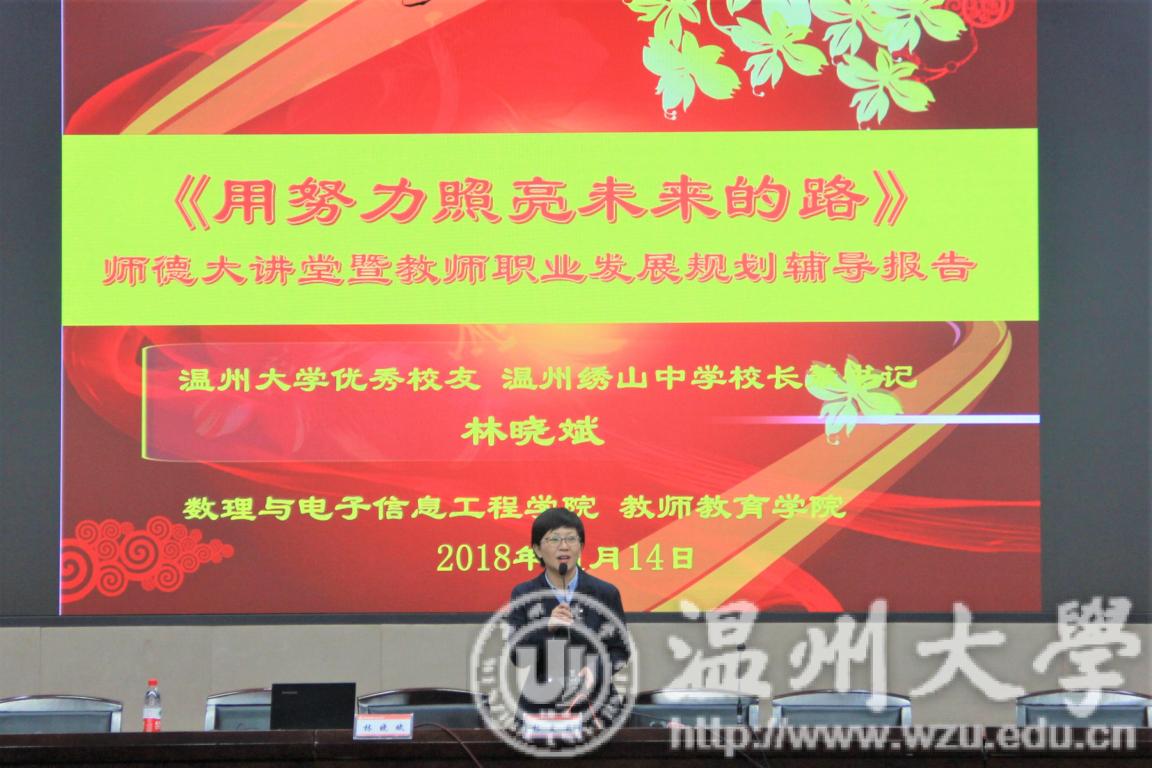 11月14日晚,温州大学岩松堂雁山厅开展了以“用努力照亮未来的路”为主题的师德大讲坛暨就业规划辅导报告会。本次讲坛由温州大学优秀校友、温州大学特聘就业顾问、现温州绣山中学校长兼书记林晓斌老师主讲。数理与电子信息工程学院党支部书记林爱菊、教师成人网站 党委副书记杨丽君以及数电学院和教院的部分学生参与本次活动。本次活动由林爱菊书记主持。