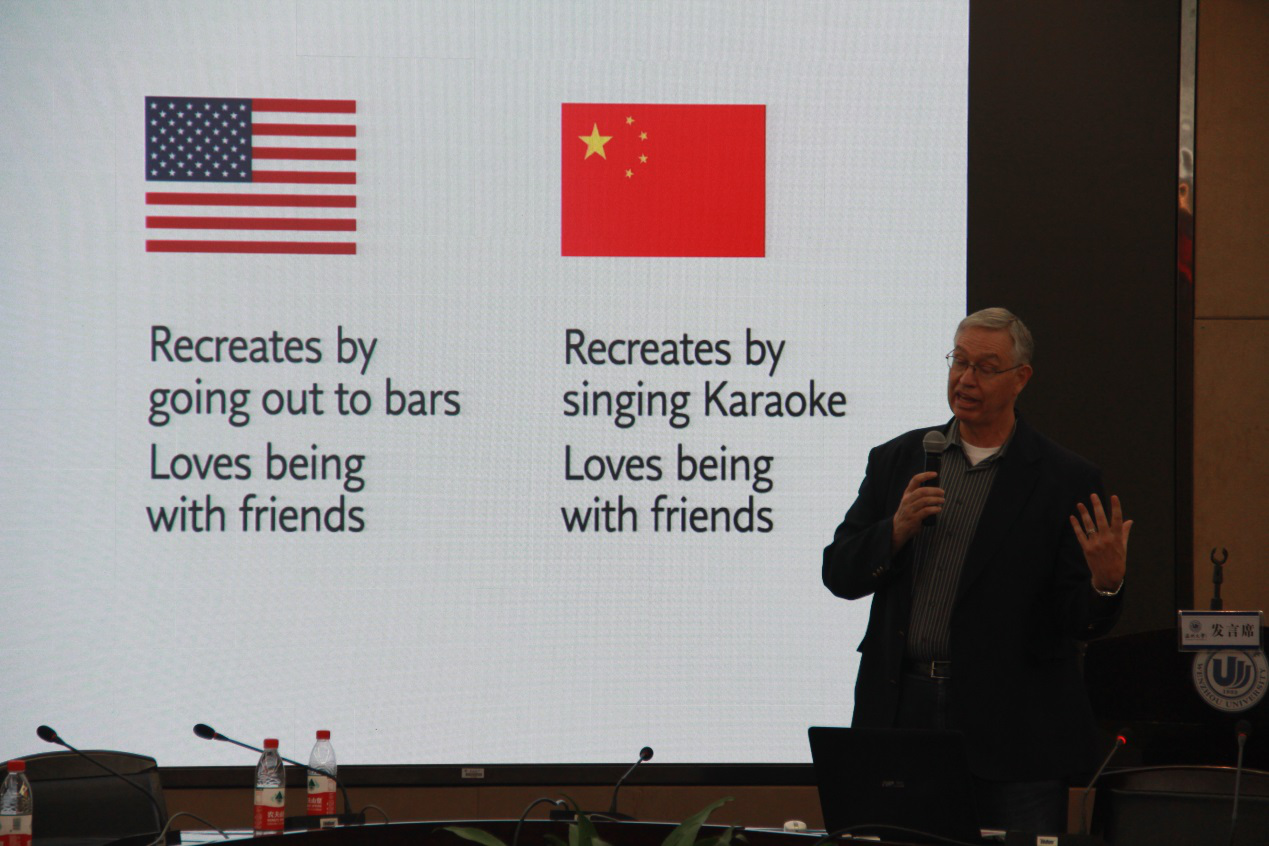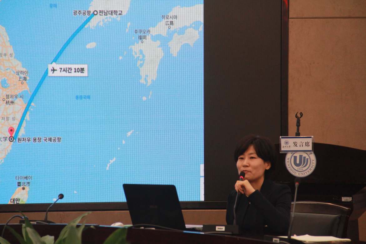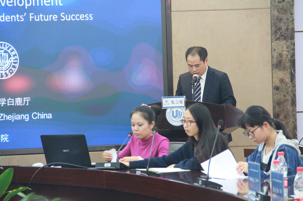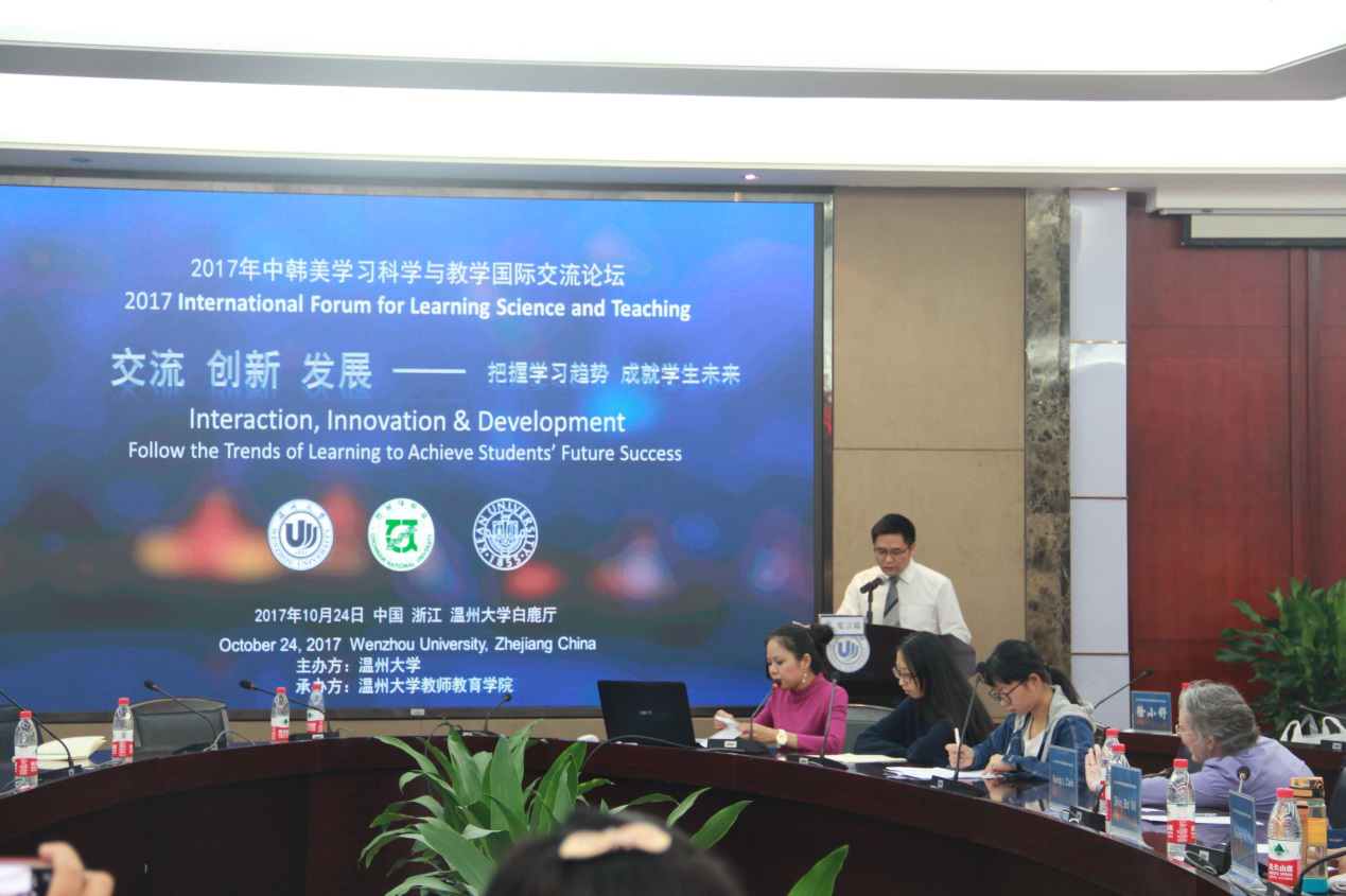 在顺应学校发展趋势中,围绕教育观念国际化、人才培养目标国际化和合作交流国际化等方面进行了教育国际化的有益探索,吸收和借鉴国外教育的先进理念和成功经验,提升学校教育现代化水平和国际交流合作领域,为培养和造就具有国际视野、具有先进理念的国际化师范人才而努力。 学习科学领域主要关注“人为什么要学习”、“人是如何学习的”以及“人应该如何学习才更有效”等三大核心基础性问题展开研究,而且,世界各国已将学习科学确立为新教育政策的关键基础,其成果深刻影响了国际教育变革的步伐和走向。从学习科学出发,研究教与学的关系,已成为世界诸多发达国家探索教育创新、革新课堂教学的新路径选择。本次论坛以“学习科学与教学”为主题,旨在通过学习科学的研究成果推动教学发展,使教育工作者更好的理解学与教的内在逻辑关系。来自肯恩大学Randy L. Clark教授以幽默风趣的开场白揭开了本次论坛的序曲,他主要从视觉可视化图形教学出发,在中国与美国学生在设计图形过程产生的思维差异作为教学研究的切入点,重点改善与优化中国学生可视化图形设计的思维,并认为图形化设计过程就是为了简洁、明了地传递信息,也是为了更加深入地加工信息,是对语言、文字等思维活动的解释说明。 Randy L. Clark教授学术演讲 来自韩国全南大学的Shin. BoMi教授,则主要从数学教育为介绍的出发点,重点探讨了韩国在数学教学、教师知识以及数学电子课本开发等方向的问题。同时,也谈到了全南大学文化特点、中韩两国教育文化的发展,尤其是全南大学与中温州大学相互合作、交流与发展的历程。 Shin. BoMi教授演讲 最后一位发言者是来自温州大学教育技术系邱创楷博士。邱博士以泛在学习环境开发为研究切入点,重点讨论了在该环境下混合式学习如何在中小学校的实施与研究,涉及到一系列的调查研究、实验研究和平台软件的开发与设计。 邱创楷博士演讲 这次国际学术交流论坛作为温州大学及教师成人网站