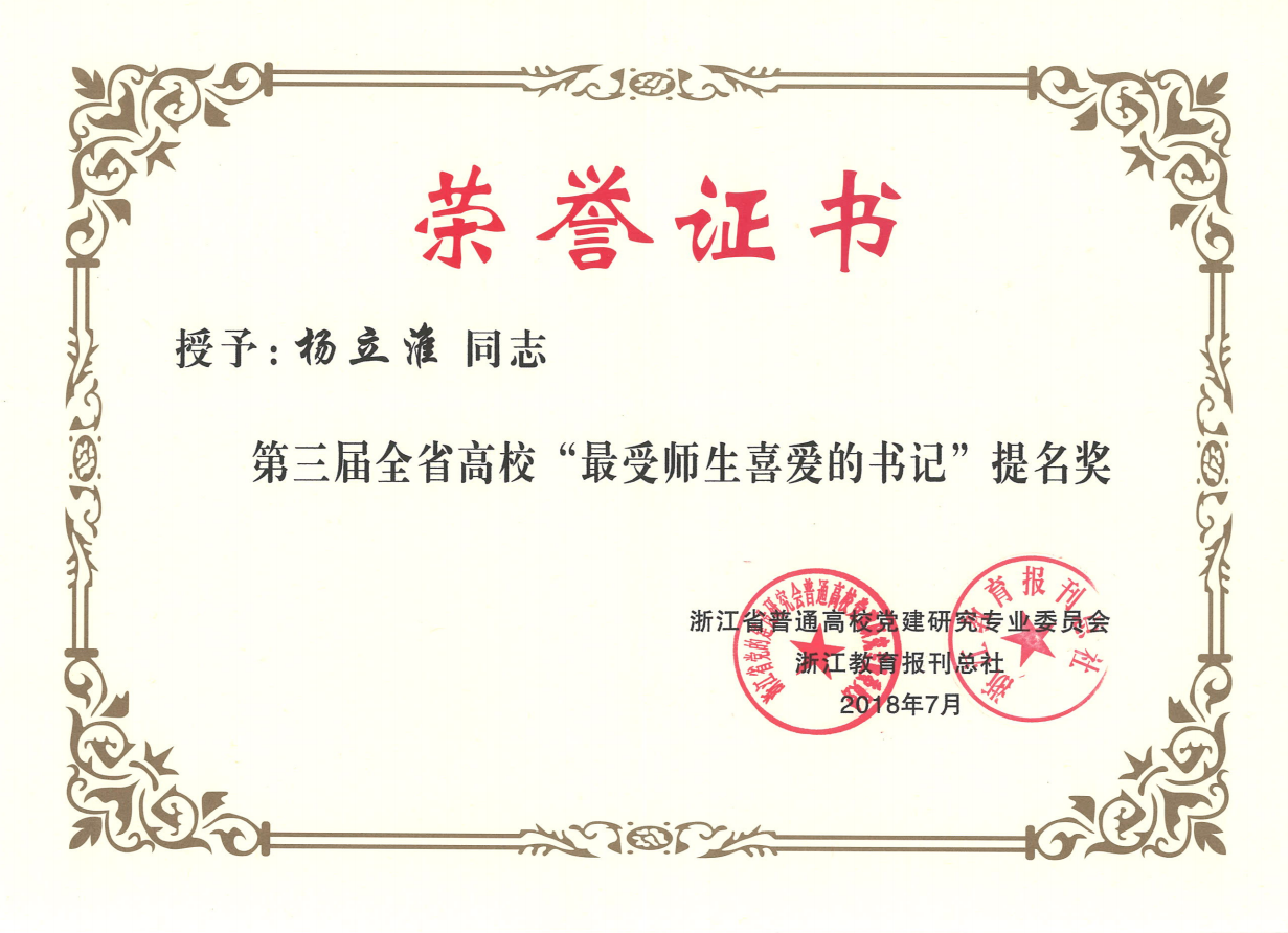 近日,浙江省普通高校党建研究专业委员会、浙江教育报刊总社公布了第三届全省高校“最受师生喜爱的书记”名单,我校教师成人网站 党委书记杨立淮获得“最受师生喜爱的书记”提名奖。