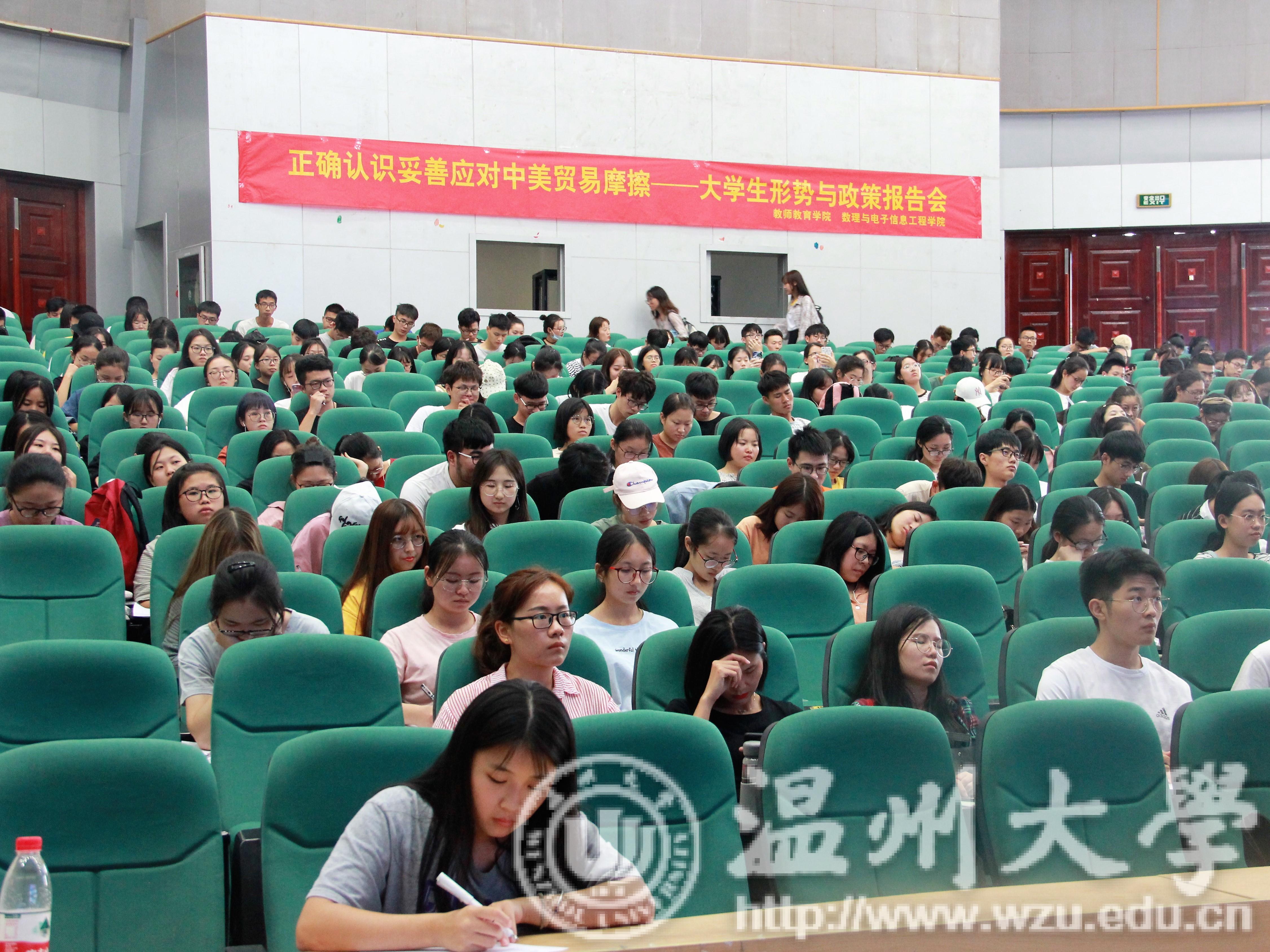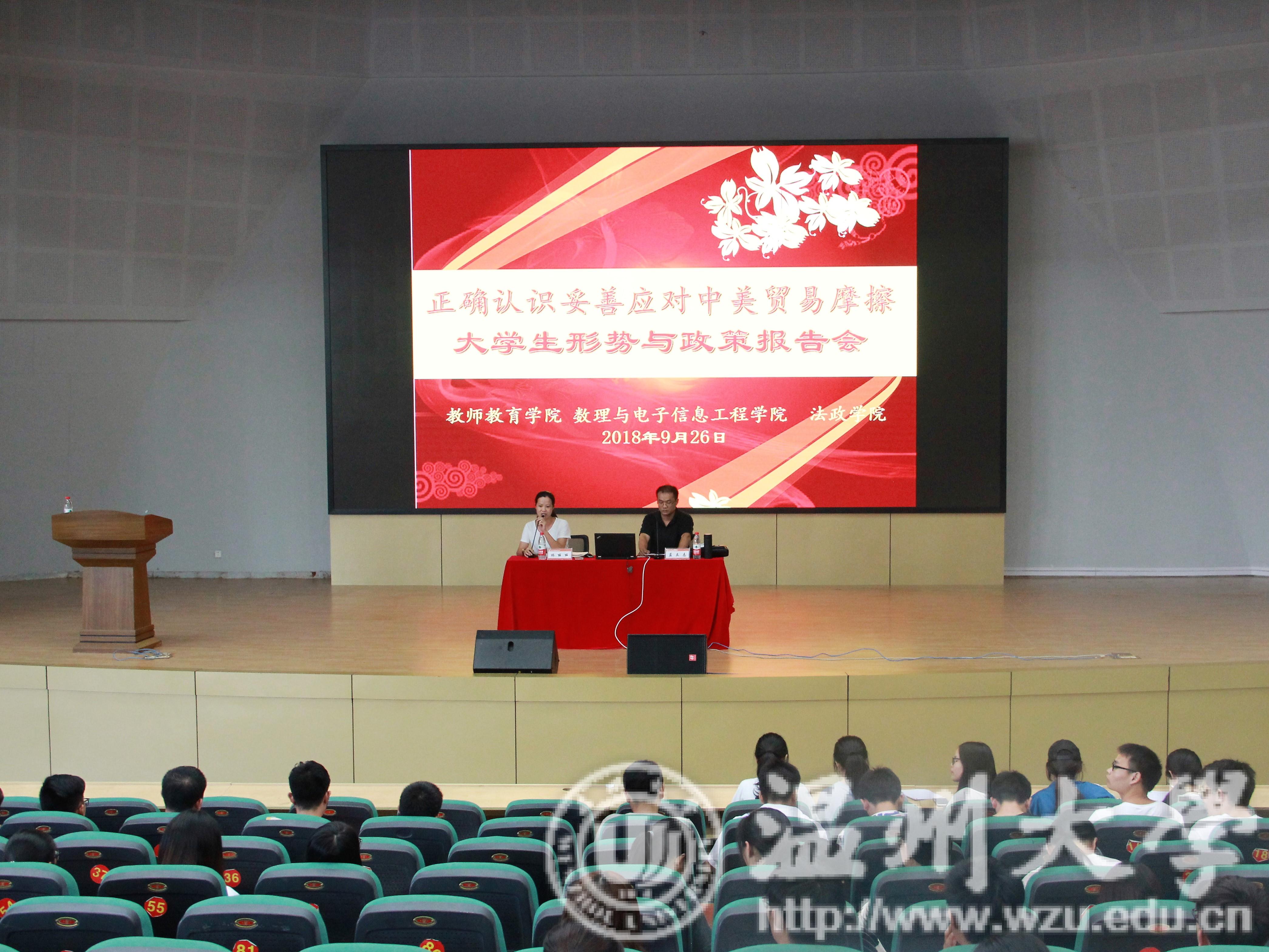 “中国确实正面临千载难逢的战略机遇,但我们更必须清醒,中国越是走近世界舞台的中央,挑战就更加严峻,这是不以人的意志为转移的。总有一些隐患我们必须通过深化改革加以解决,总有一些坎我们必须勇敢迈过去。”2018年9月26日13:30,由教师成人网站 、数理与电子信息工程学院以及法政学院共同举办的“正确认识妥善应对中美贸易摩擦”大学生形势政策报告会于教师成人网站 一楼报告厅举行。本次报告会邀请马克思主义学院的蓝立志老师主讲。报告会由数电学院学生科副科长林丽丽主持。