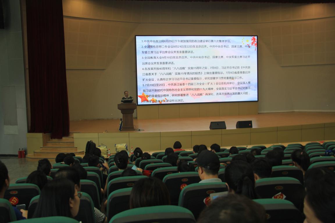 杨立淮书记作教职工作理论学习会专题报告。杨立淮书记围绕加强党的政治建设会议、全国宣传思想工作会议、全国教育大会、学习贯彻习近平总书记“八八战略”实施15年情况重要指示、省委十四届三次全会等五项党建与宣传工作会议及文件精神组织全院教职工专题学习。他强调全国宣传思想工作会议是党中央对宣传思想工作的又一次战略部署,习近平总书记在全国宣传思想工作会议上强调,举旗帜聚民心育新人兴文化展形象,更好完成新形势下宣传思想工作使命任务,开创宣传思想工作新局面;学习贯彻习近平在中央政治局第六次集体学习重要讲话精神,把党的政治建设摆在首位,以党的政治建设为统领;学习贯彻全国教育大会精神,坚持社会主义办学方向,立足基本国情,遵循教育规律,坚持改革创新,以凝聚人心、完善人格、开发人力、培育人才、造福人民为工作目标,培养德智体美劳全面发展的社会主义建设者和接班人,加快推进教育现代化、建设教育强国、办好人民满意的教育;学习贯彻习近平总书记在“八八战略”实施15周年情况报告上的重要指示精神,深刻领会和全面把握这15年来浙江改革发展所取得的一切成就,归根到底都是“八八战略”正确指引的结果,是干在实处、久久为功、一抓到底的结果,进一步深刻认识“八八战略”是统揽浙江一切工作、指导浙江今后发展的总方略;认真学习省委十四届三次会议精神,推进“八八战略”再深化、改革开放再出发,落实推进清廉浙江建设的决定与要求。他还指导全院教职工深入学习学院下发的5本理论学习材料汇编,并积极用以指导学院各项事业发展和教职工自身成长中去。