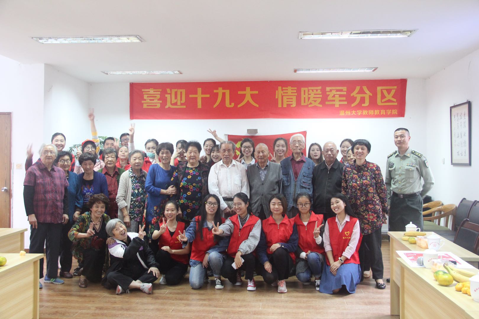 学生志愿者走进温州市军分区干休所,举行“不忘初心跟党走”的文艺汇演,用歌声和舞蹈向曾经的革命先辈们致敬。